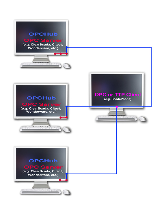 In addition to OPC communication (which relies upon Windows COM and DCOM), OPCHub also supports a simplified network communication protocol named TTP (Tag Transfer Protocol); TTP was developed by ScadaTEC to provide a means for bypassing Windows DCOM configuration issues. TTP can be used to link OPCHub to other ScadaTEC applications (such as other installations of OPCHub, ScadaPhone, ScadaLogger, ModbusTagServer, etc...).